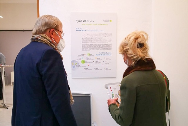 Am Sonntag, den 11.10.2020, war unsere Ausstellung dann von 10-18 Uhr für die Öffentlichkeit zugänglich. Unsere 4 Informationstafeln luden dazu ein, sich einen Ein- und Überblick über die Synästhesie und die DSG zu verschaffen. Die Kunstwerke der 7 Aussteller, sowohl in Form von Bildern, Skizzen, Skulpturen und Filmen, zeigten in ihrer Vielfalt einen guten Querschnitt durch die bunte, tiefgreifende Welt der Synästhesien. Generell waren das Interesse und die Bewunderung groß! Einige Besucher kannten das Phänomen Synästhesie bereits, andere zeigten sich sehr offen und interessiert, auch an einer weiteren Kooperation mit der DSG. Die ausliegenden Informationsmaterialen wurden gerne mitgenommen.
