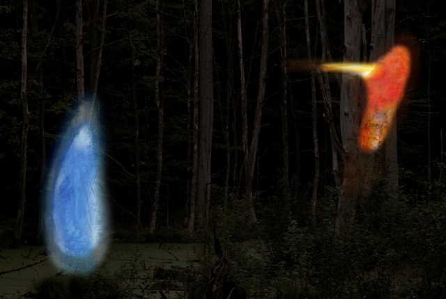 Was sagen deine Farben?, fragte sie. Es war als ob... noch nie hatte mich jemand diese Frage gefragt. Ganz klar: rechts, in Flussrichtung, bergab, war es tiefrot und schwarz, kantig wie ein Knochen, nach einem Bruch wieder geheilt, wie eine im Gefäß erstarrte Flamme, lichterloh und still. Doch links, bergan, waren tief dichte, in blaues Licht getauchte und im Kern neblig-leuchtende auratische Wolken, wie in einer arabischen Nacht, in Erwartung des Chagall’schen Paares auf dem Pferde, das jeden Moment im Aufstiegwirbel emporzuschweben vermöchte.